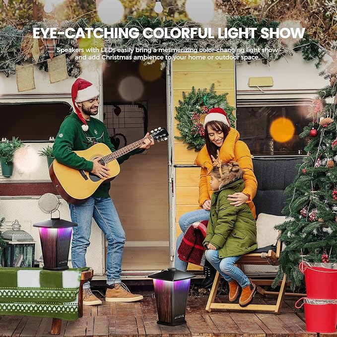 - 【What You Get】: The outdoor speaker set comes with 2 Bluetooth speakers with lights, 2 Type-C charging cables, 2 3.5mm audio cables, 2 ground stakes, instruction manual, and our worry-free 12-month warranty and friendly customer service. Rated IPX5 water-resistant, this pair of waterproof outdoor speakers are built to withstand spills, light rain, or splashes, so it can be safely used in your home, balcony, patio, backyard, garden, lawn, pavilion, or by your swimming pool