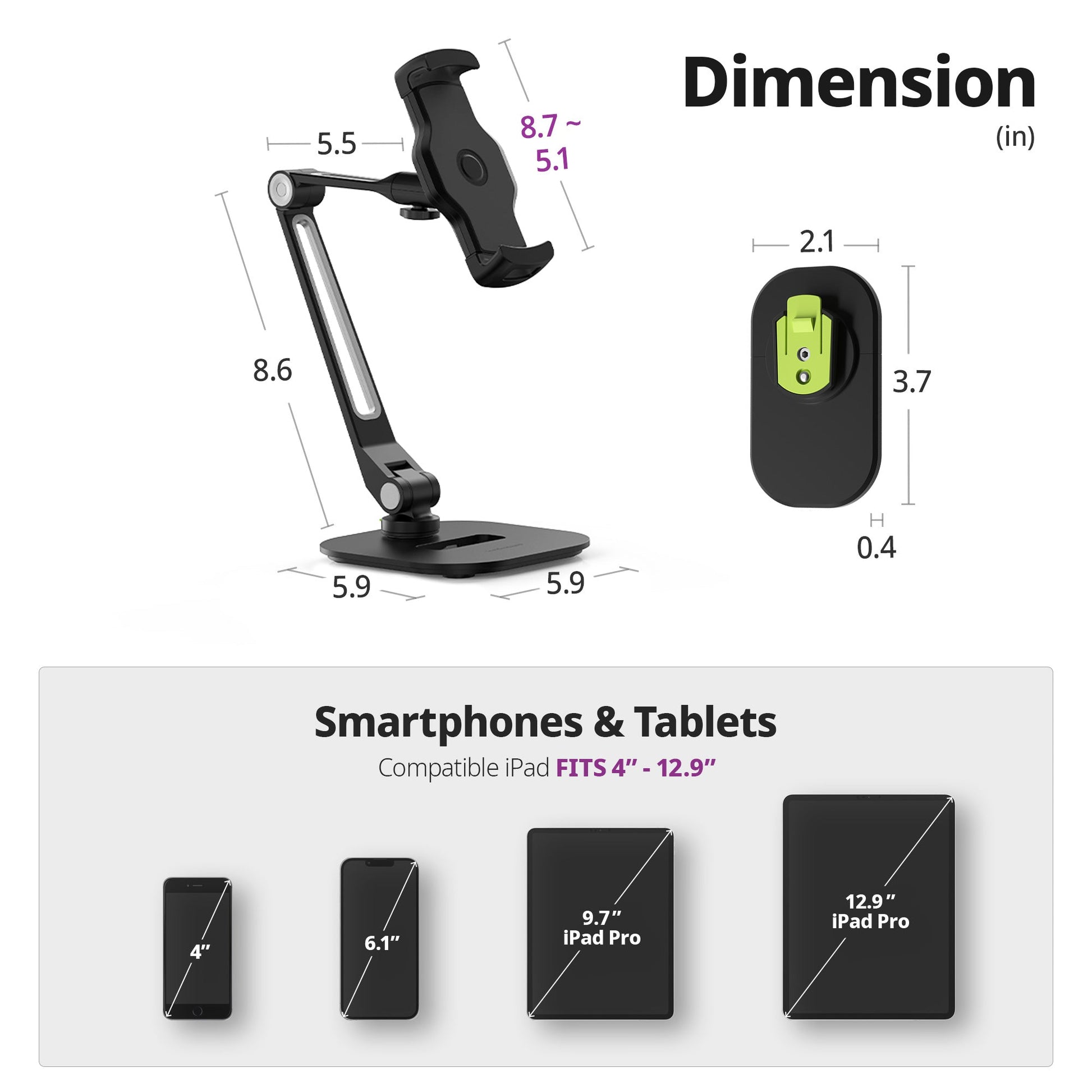 The non-slip silicone padded bracket holder ensures scratch-free protection for your smart device and the 360-degree rotatable head lets you easily adjust your phone and tablet to any viewing angle.