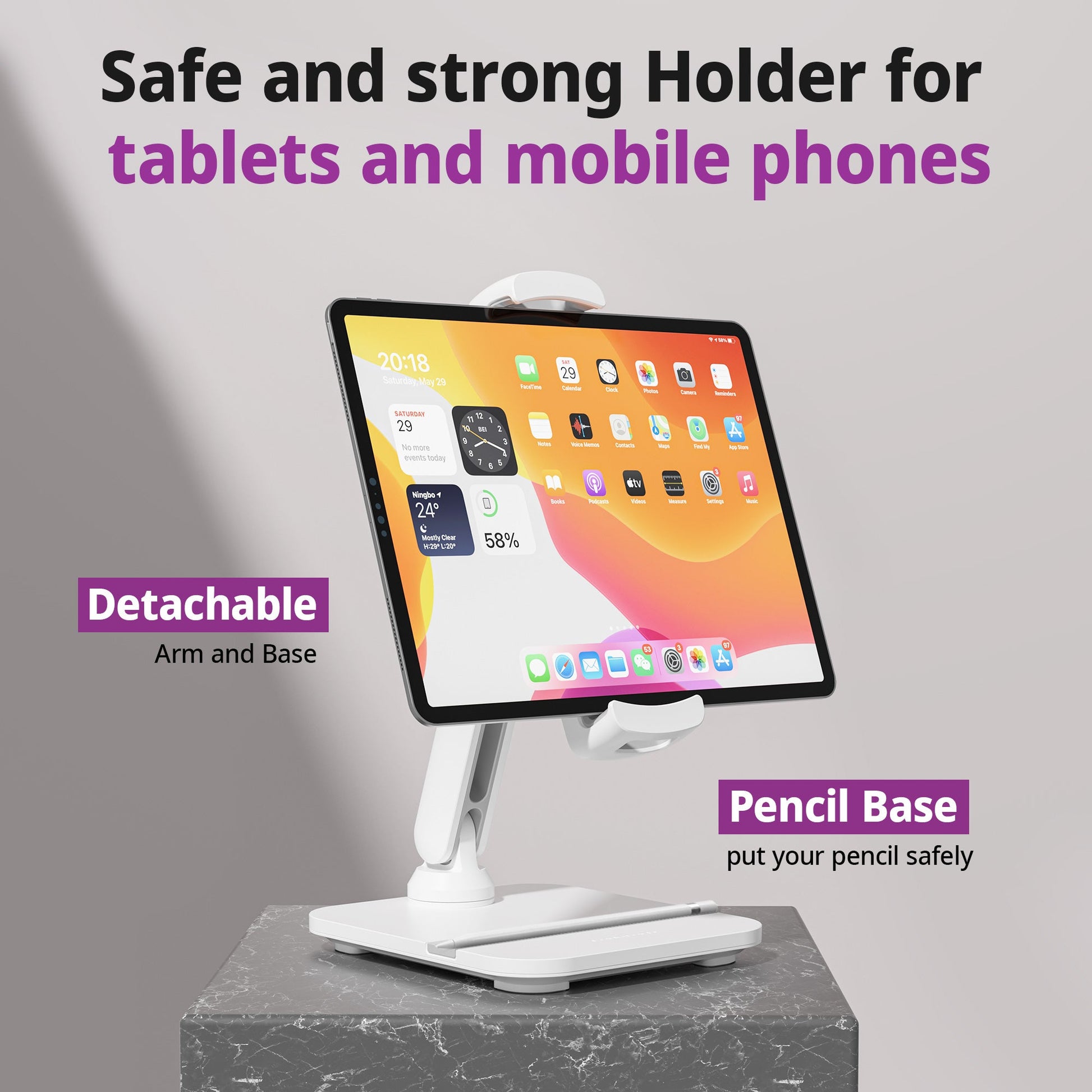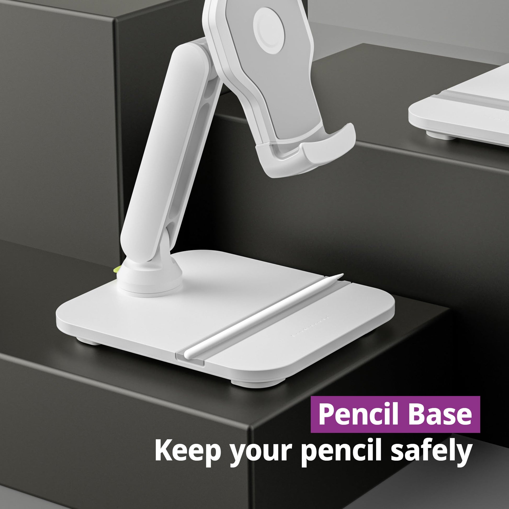 The pencil base provides safe support for various tablets and smartphones by using a heavy aluminum metal base with a non-slip rubber pad underneath it. More importantly, the pencil base contains a convenient slot for secure placement of your tablet pencil or drawing implement.