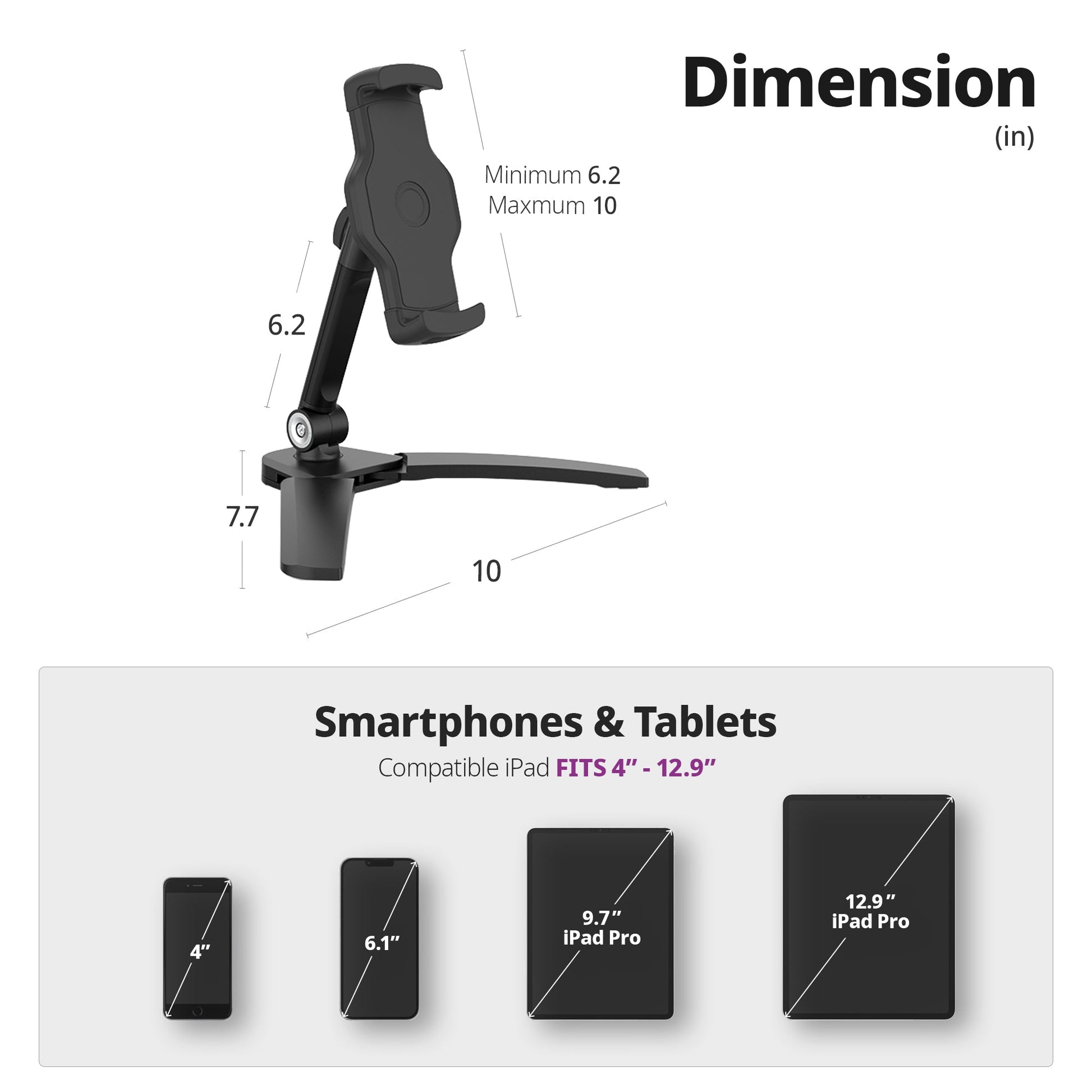 Compatible with smartphones and tablets with dimensional widths from 4" to 12.9". Display tablet PCs (iPad Air/Mini/10.5-inch iPad Pro/Galaxy Tab) or Smartphones (iPhone 15, 14, 13, 12, 12 Pro Max, X 8 & 8 Plus / Samsung Galaxy).